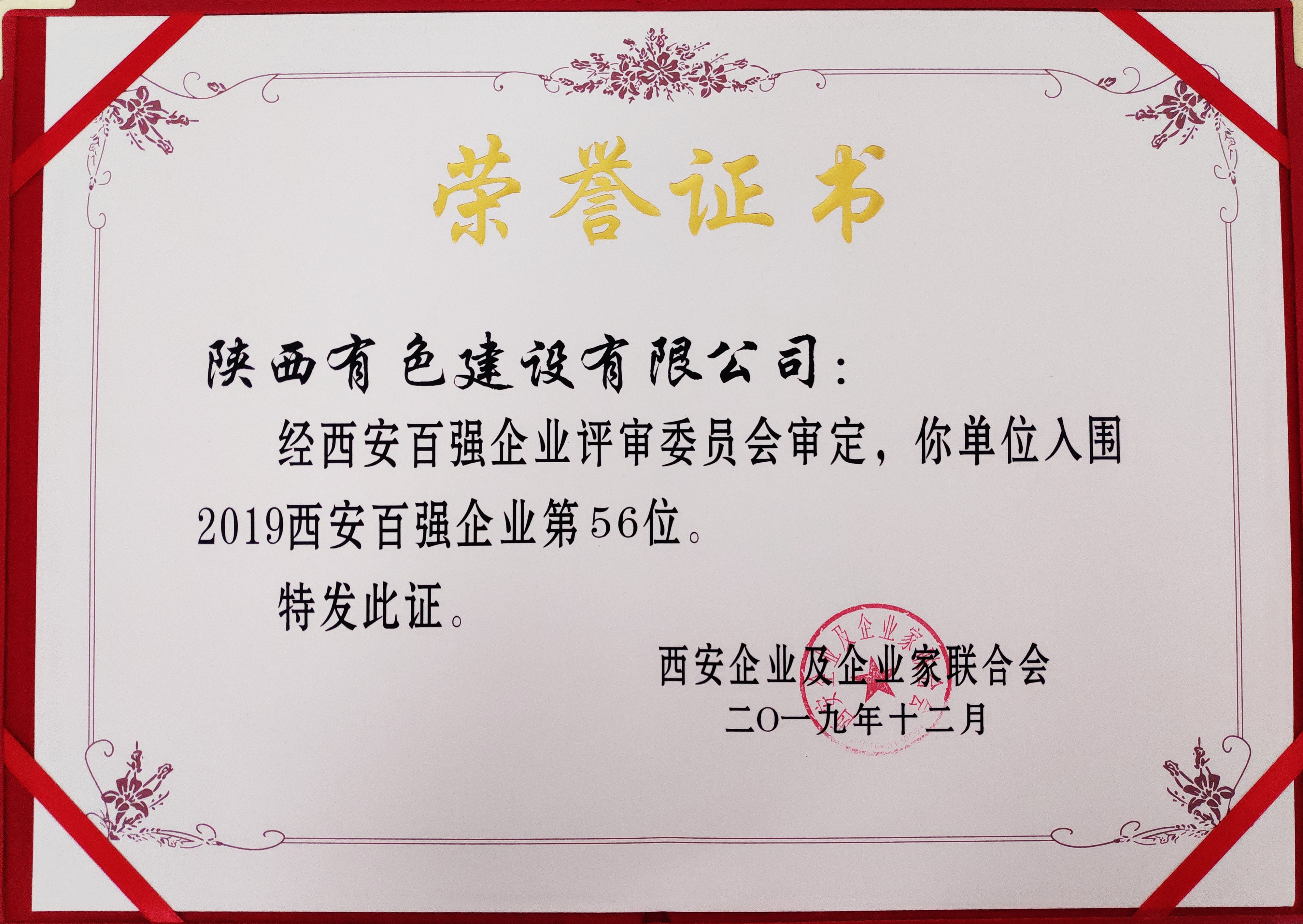 近日,《2019西安市百?gòu)?qiáng)企業(yè)》名單隆重揭曉,我公司憑借雄厚的實(shí)力和強(qiáng)勁的發(fā)展勢(shì)頭,榮登西安市企業(yè)百?gòu)?qiáng)榜單,位列第56位。這是公司繼獲得“西安市2019年建筑業(yè)高質(zhì)量上規(guī)模發(fā)展企業(yè)”之后的又一項(xiàng)殊榮。